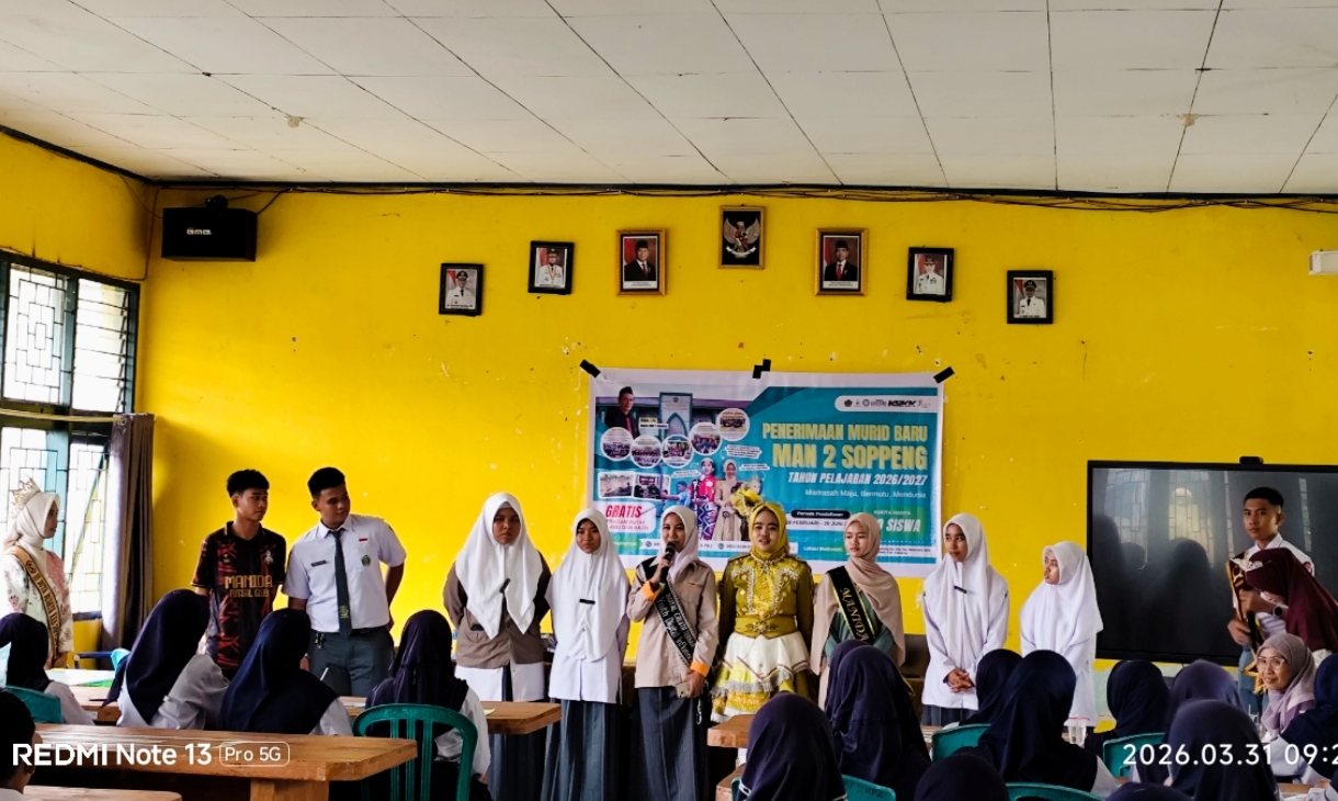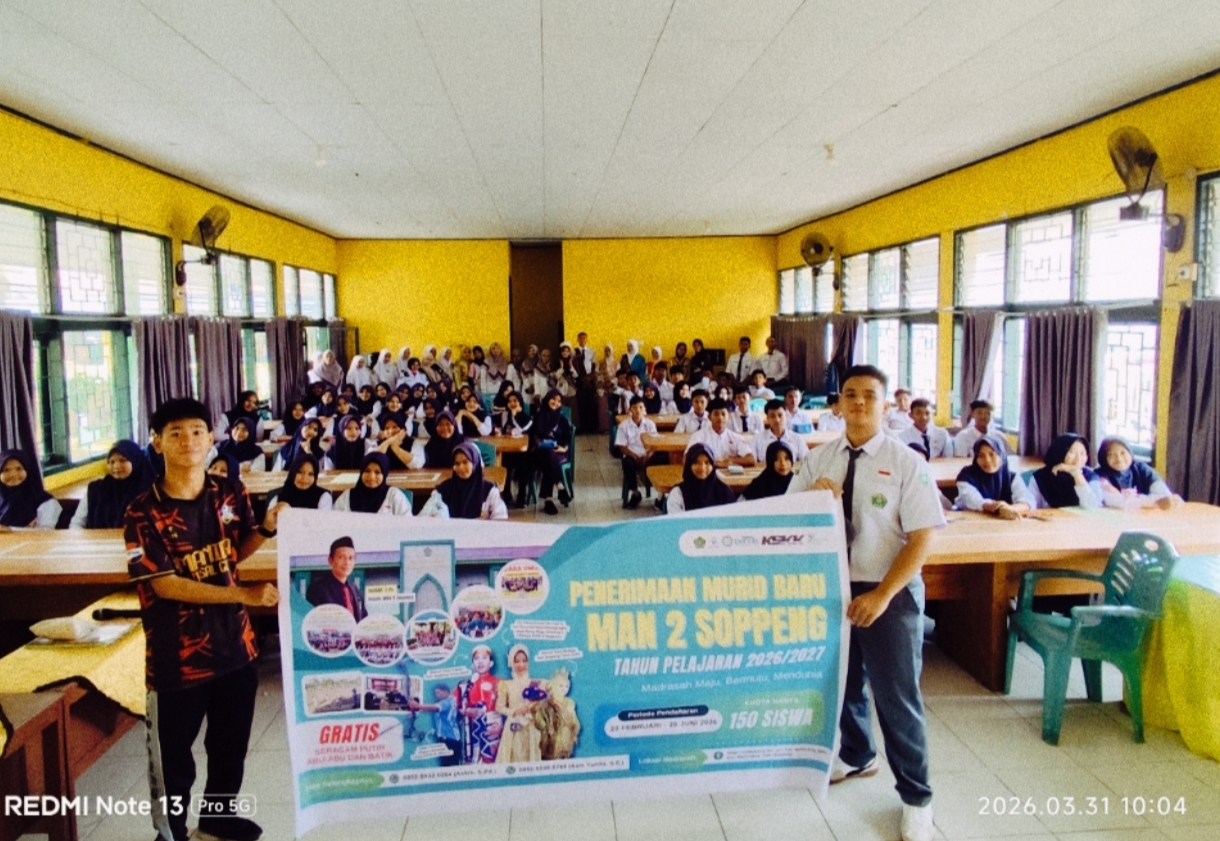 Salah satu agenda sosialisasi yang mencuri perhatian berlangsung di SMPN 1 Marioriawa pada Selasa (31/03/2026). Dalam kegiatan ini, MAN 2 Soppeng tampil berbeda dengan menghadirkan langsung siswa berprestasi, Andi salsabil, atlet andalan yang telah berkiprah di ajang PORPROV dan Afif atlet nasional panahan. Kehadirannya menjadi magnet tersendiri bagi ratusan siswa yang antusias mengikuti kegiatan.